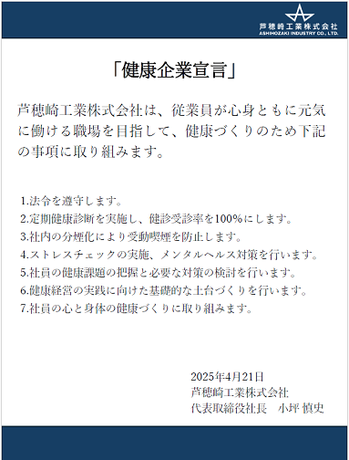 芦穂崎工業(株)は、健康保険組合と協力して従業員の健康づくりの取組みを積極的に行っていると認められ、「かながわ健康優良企業」の認定を取得いたしました。